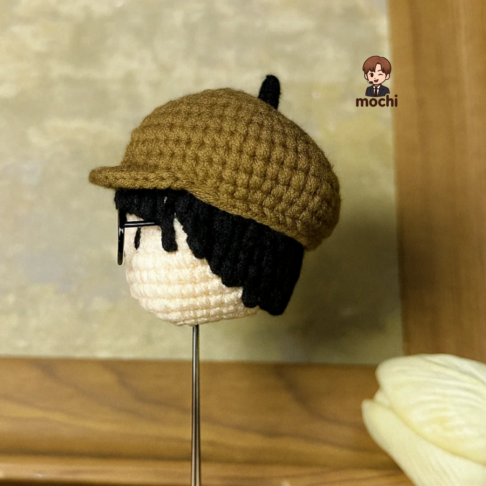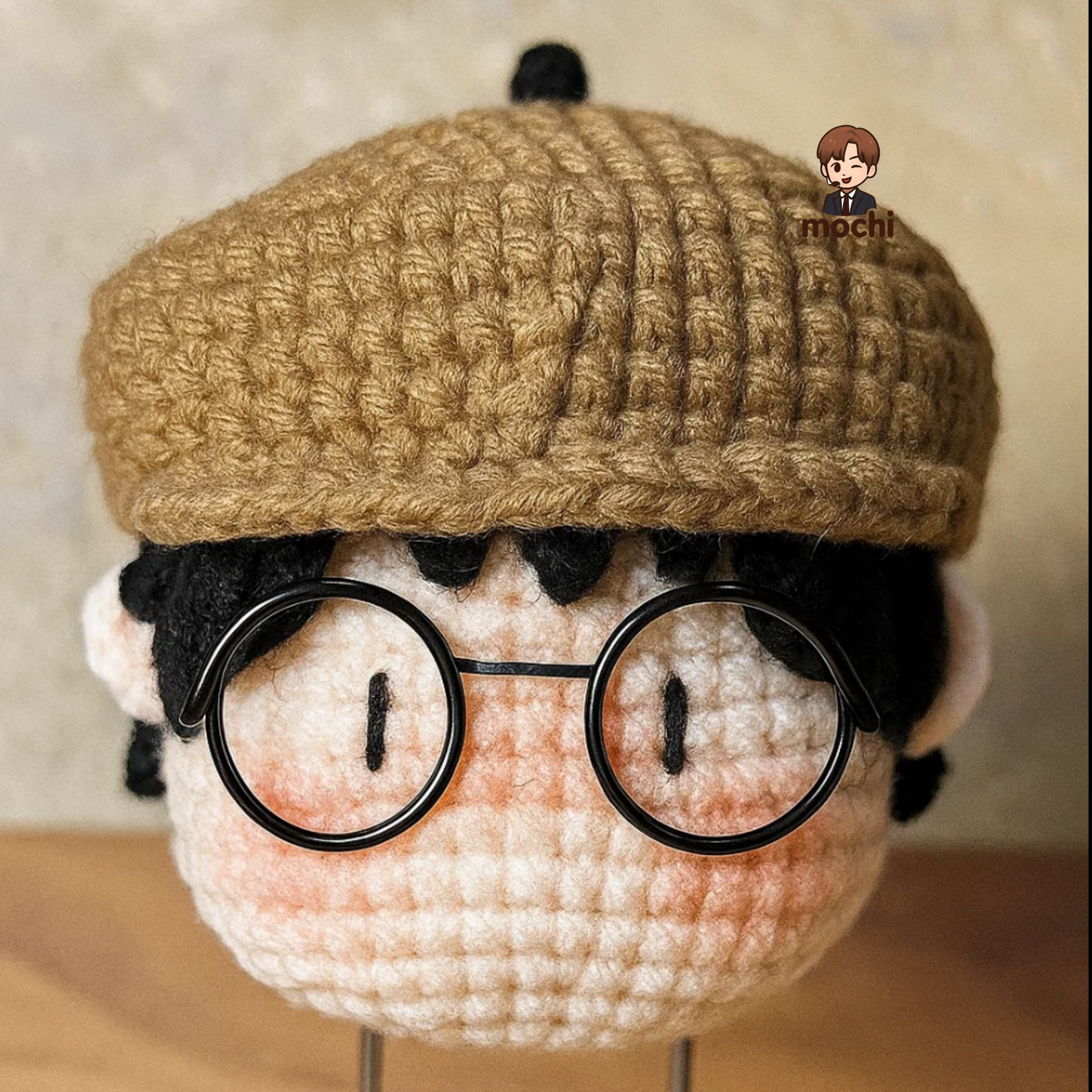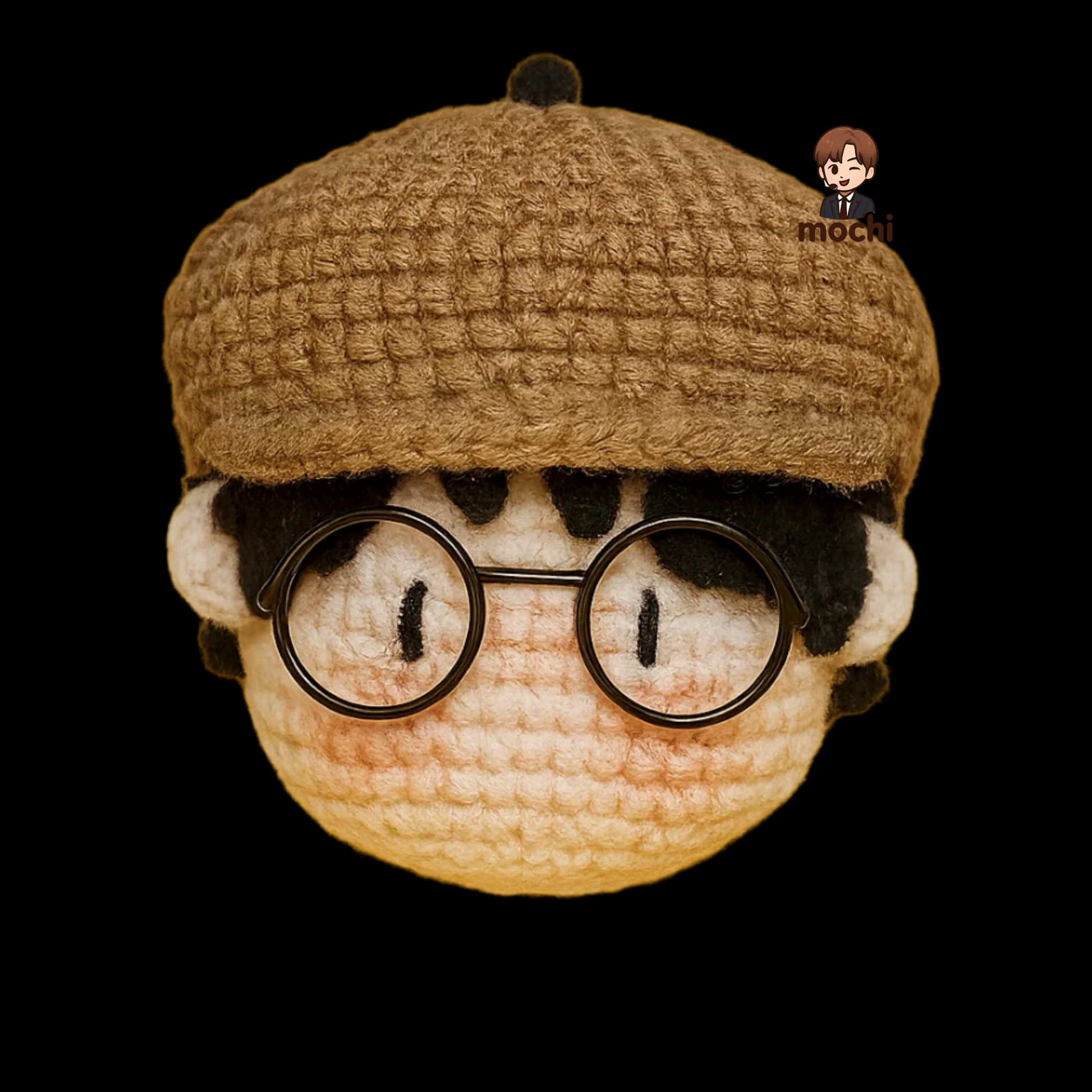 The doll features a cozy brown knit newsboy cap paired with signature round black glasses 🤓, perfectly recreating DK’s cute and artsy vibe. Delicate crochet work brings out the soft hair details and rosy cheeks, making the figure come to life.