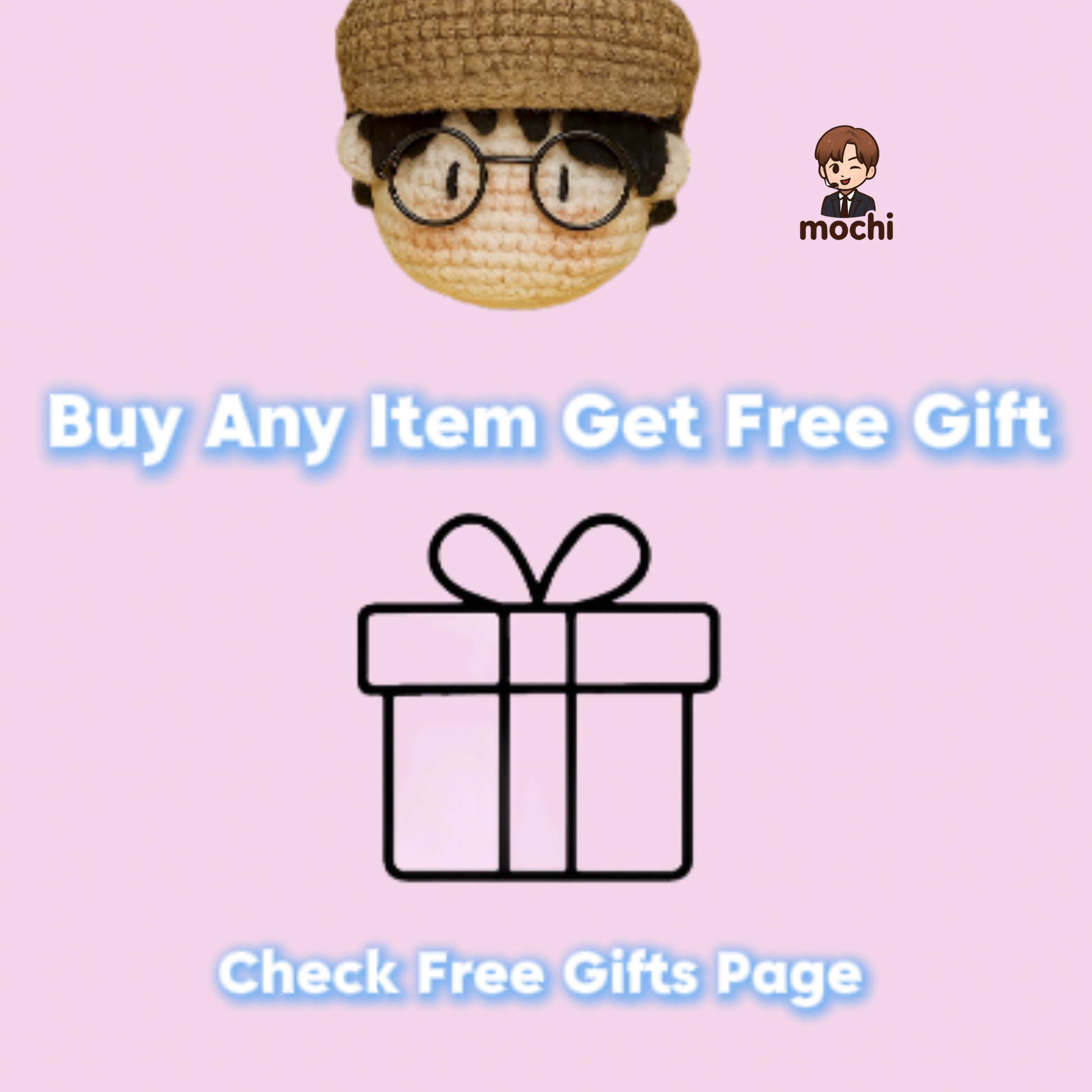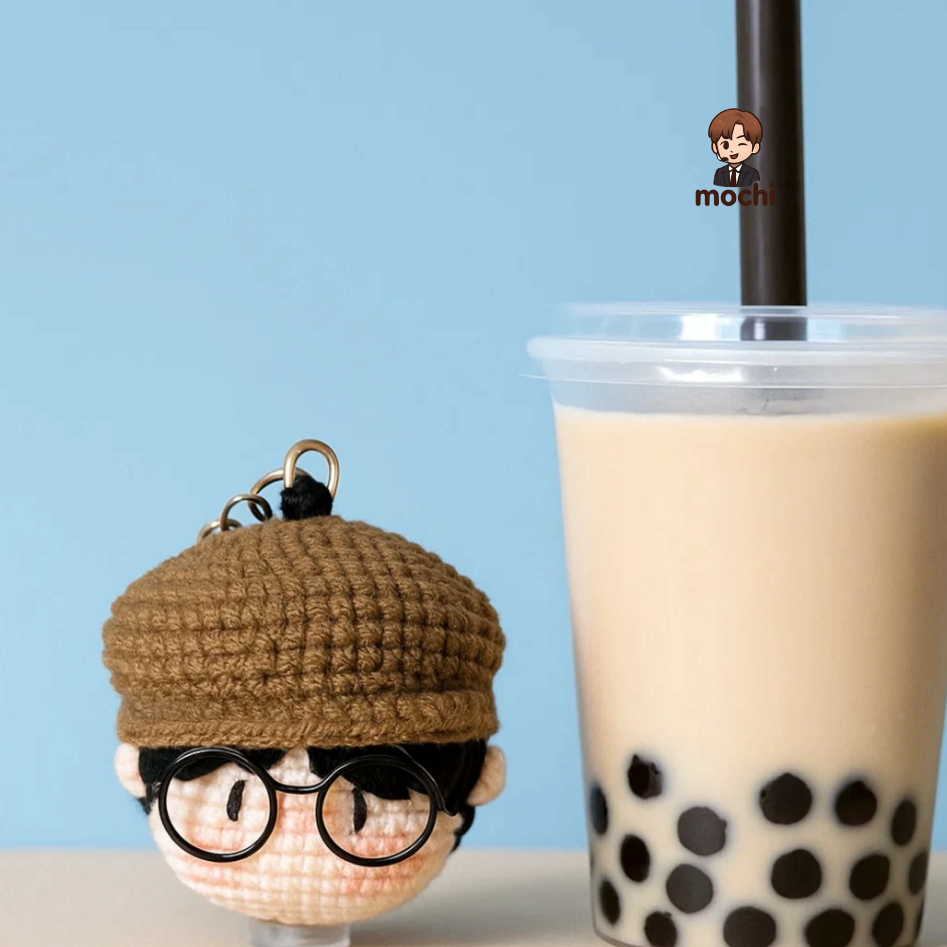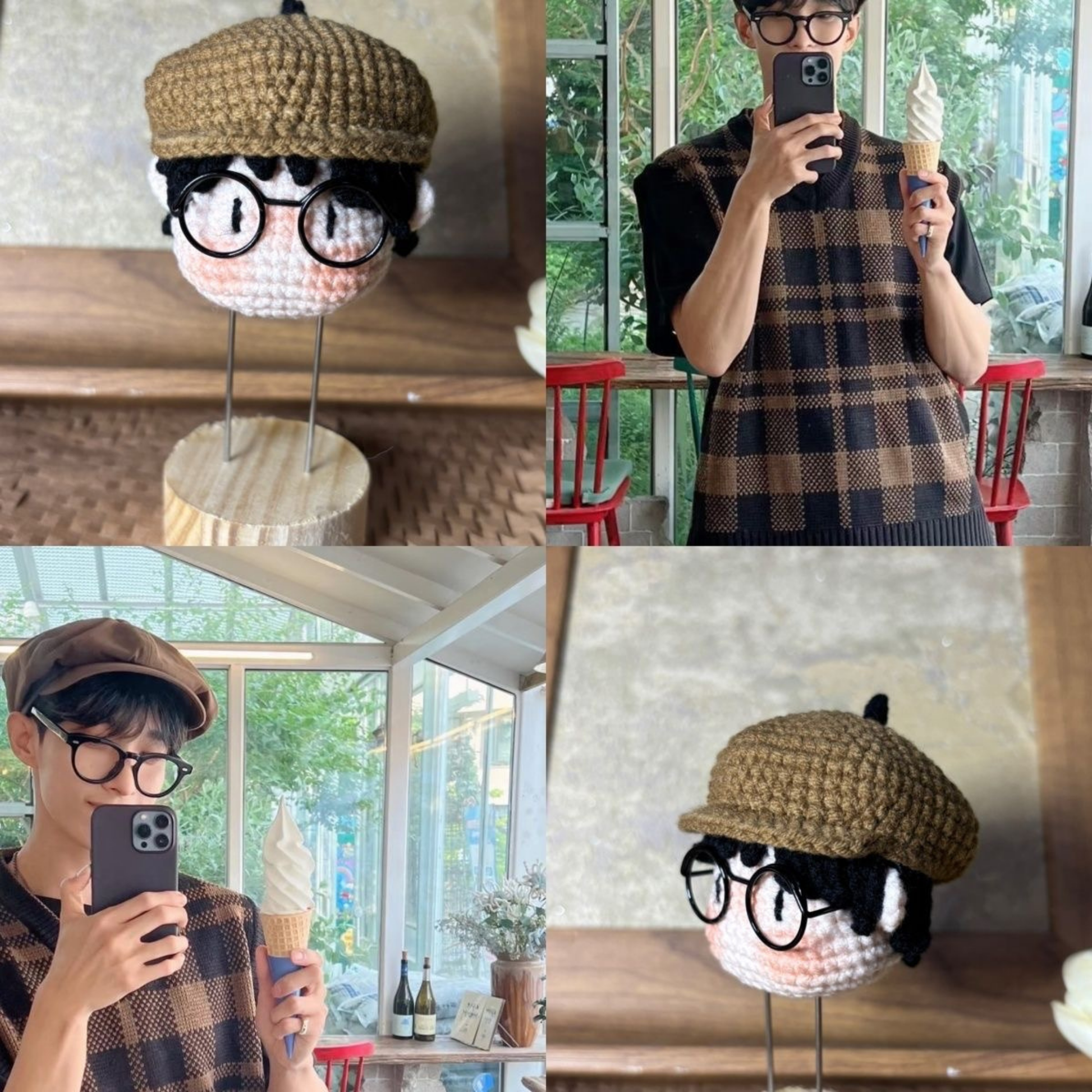 The doll features a cozy brown knit newsboy cap paired with signature round black glasses 🤓, perfectly recreating DK’s cute and artsy vibe. Delicate crochet work brings out the soft hair details and rosy cheeks, making the figure come to life.
