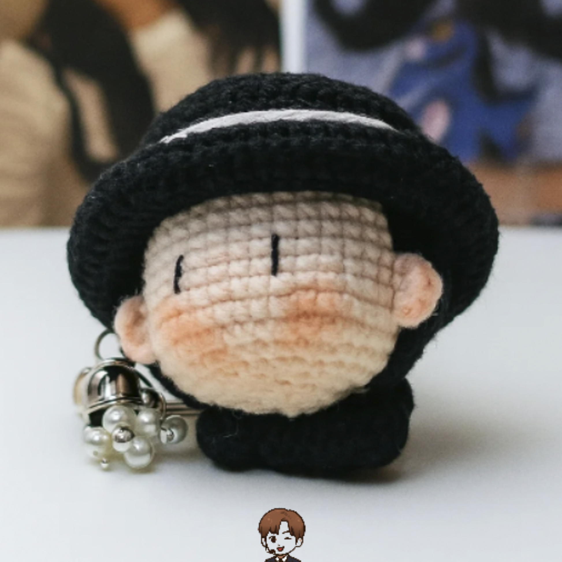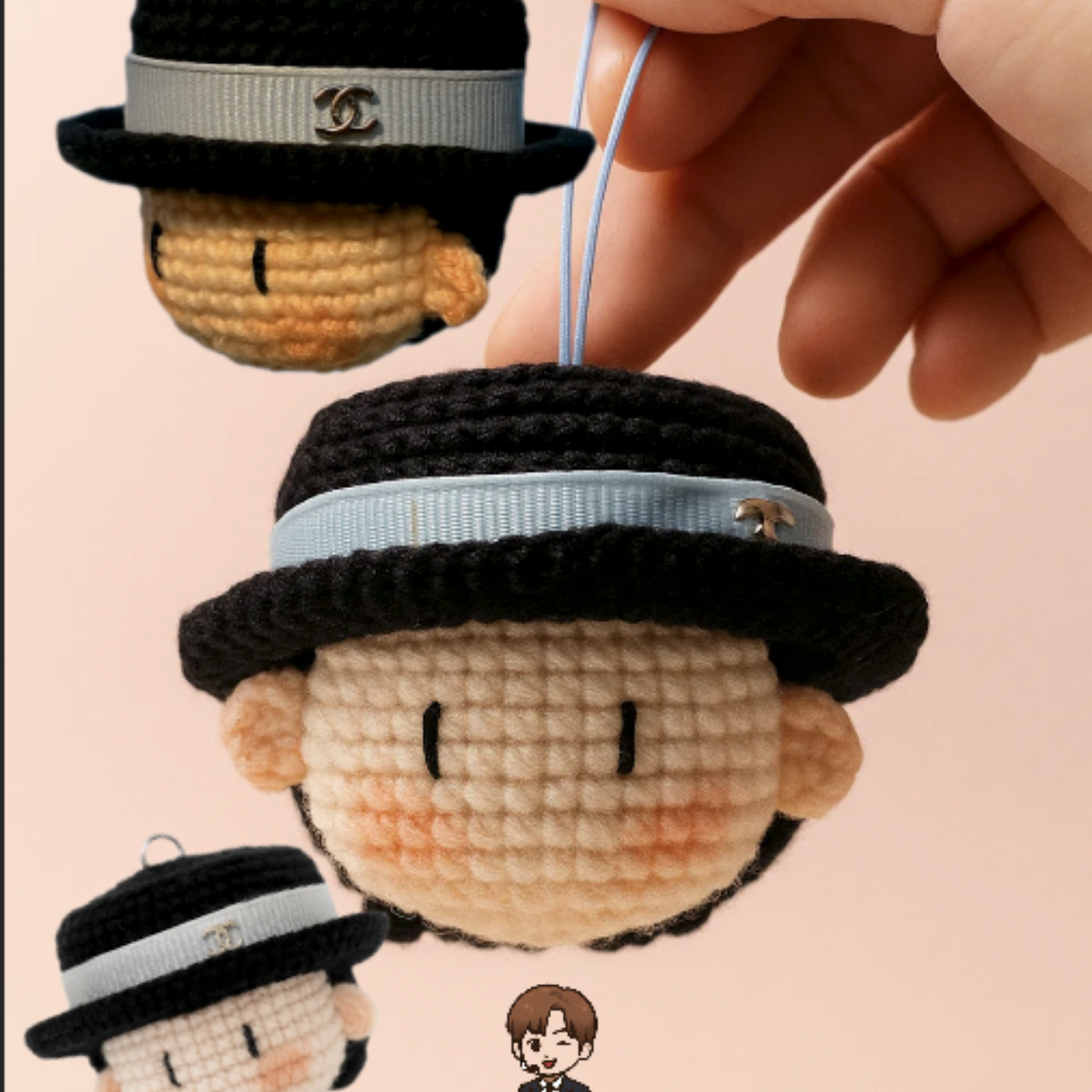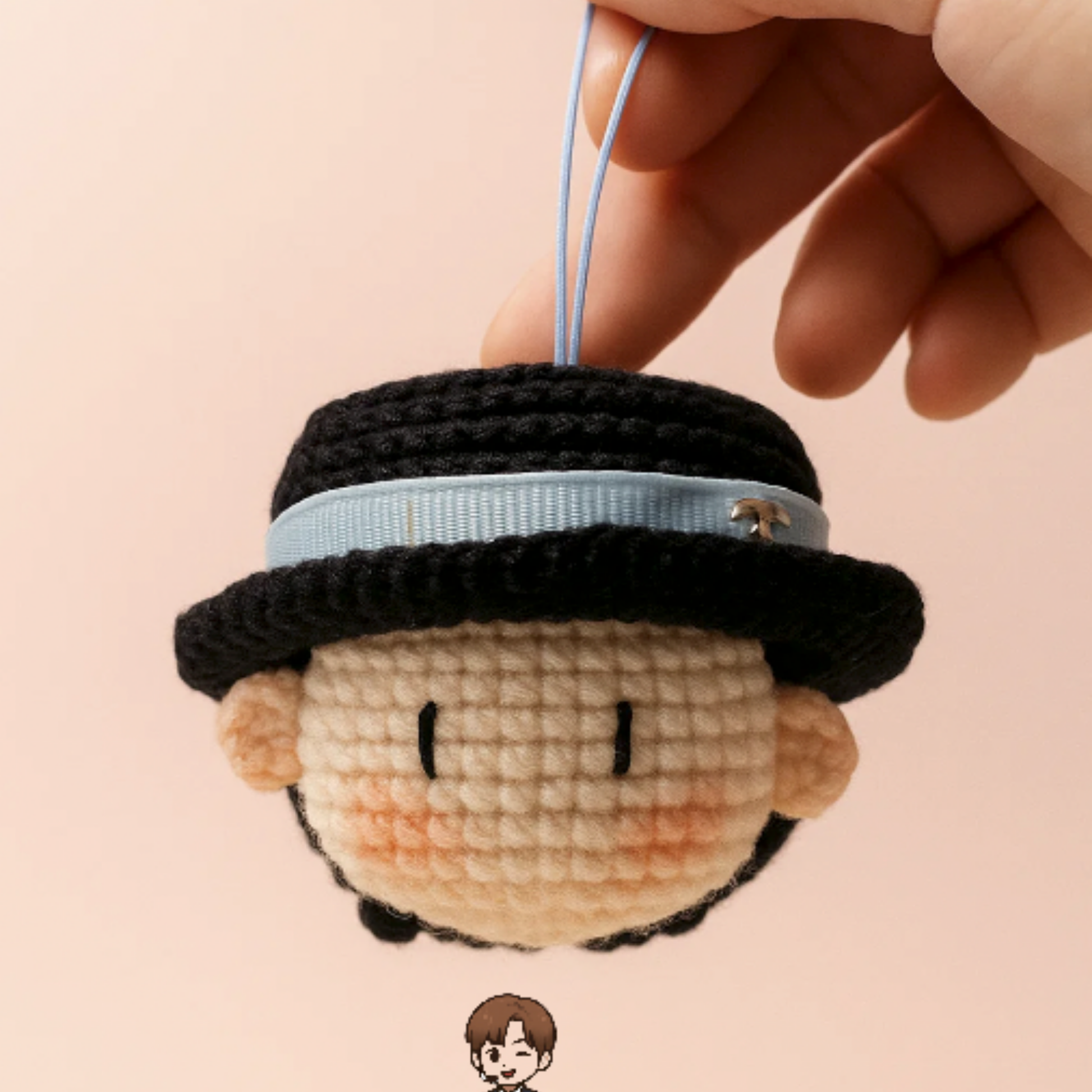 Each piece is carefully crafted with soft, high-quality yarn, featuring her iconic black hat with a blue ribbon, rosy cheeks, and minimalist K-pop-inspired style. Perfect for K-pop fans, collectors, and anyone who loves unique handmade accessories.